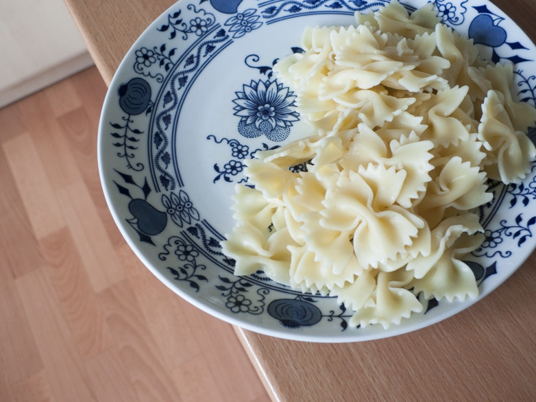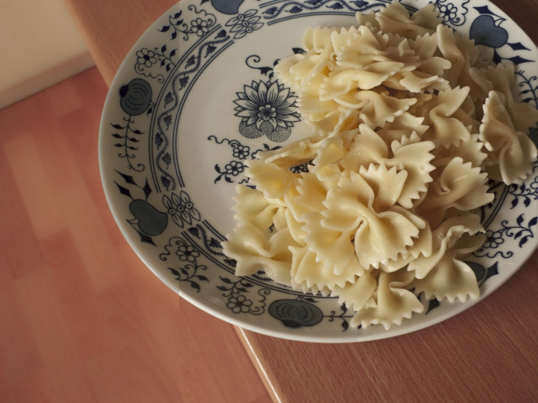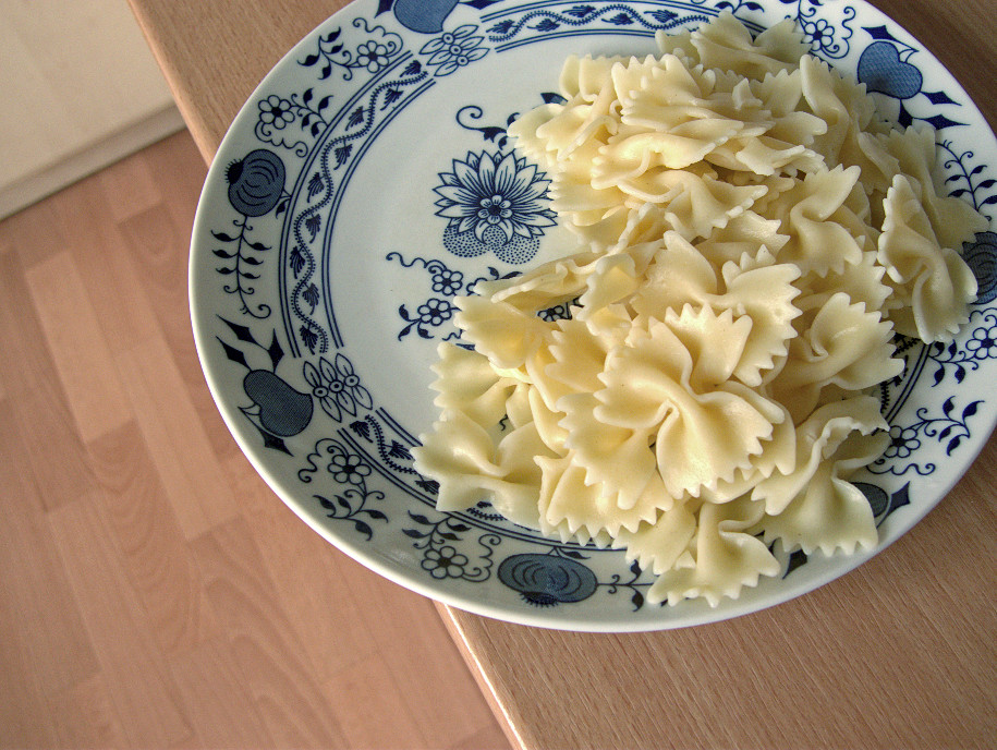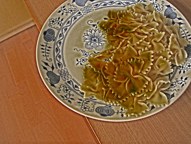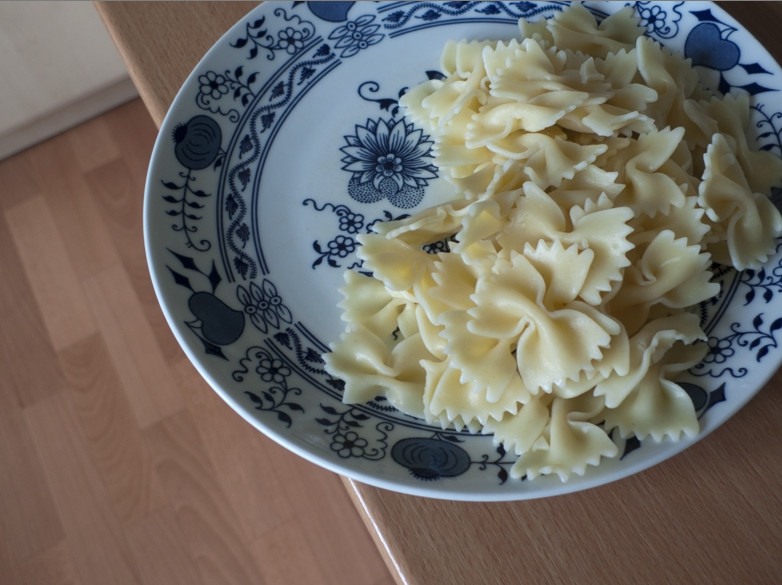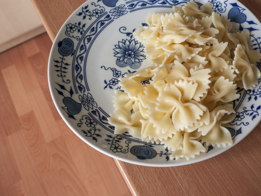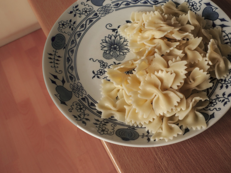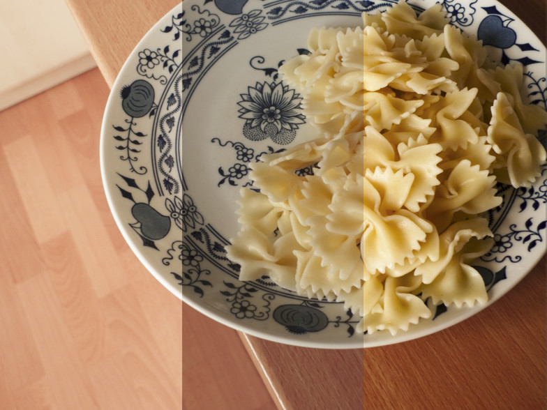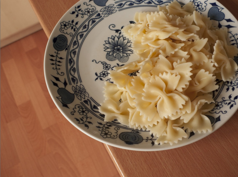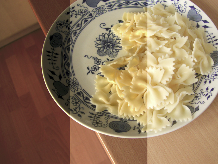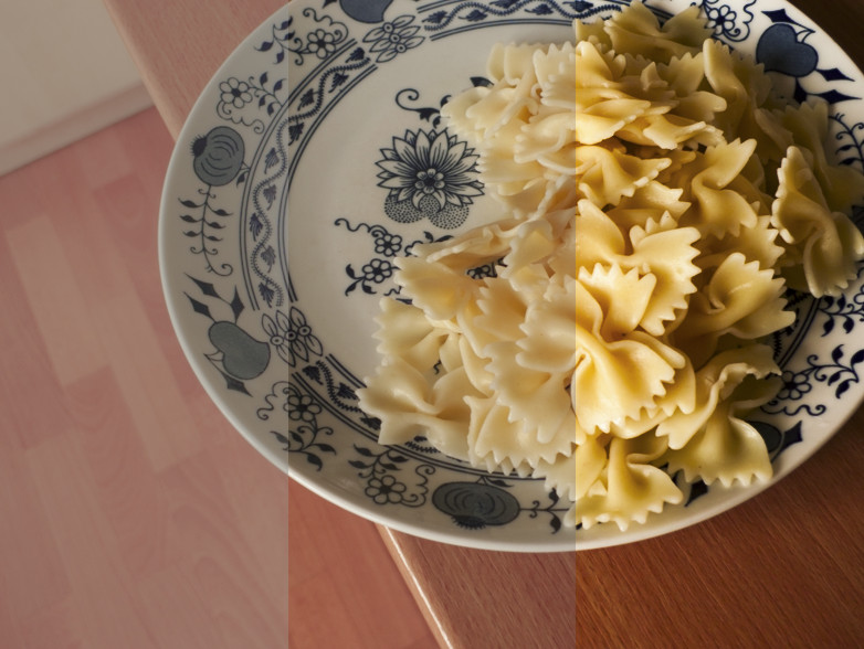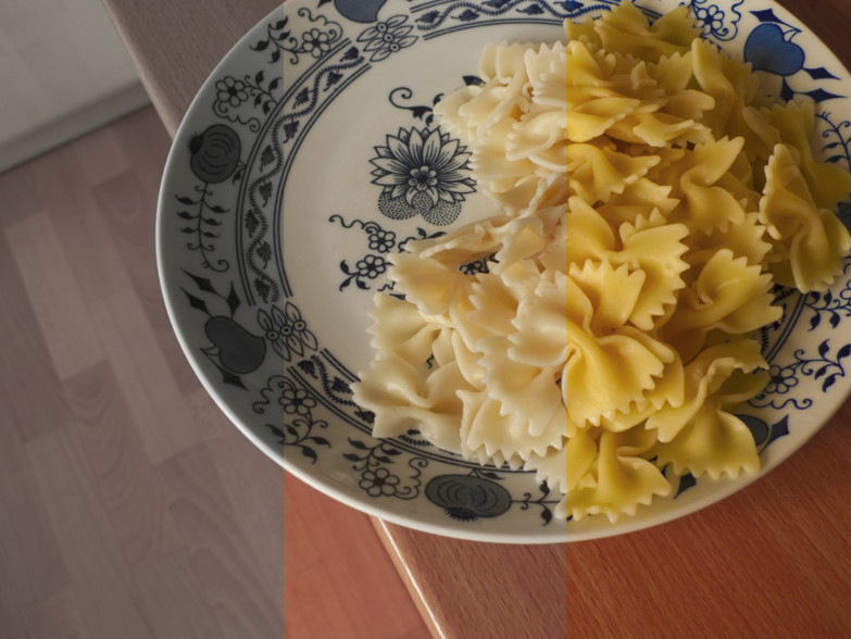 V Lightroomu ve verzi procesu 2010 došlo k posunu teploty chromatičnosti směrem ke studeným odstínům, takže došlo k redukci barevné odchylky, ale příliš silně – bílý talíř získal modrý nádech. Byla o téměř 1 EV zvýšena expozice, ale byla o 50 bodů snížena svělost, takže výsledná fotografie zůstala podexponovaná.