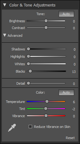 Z panelu Color & Tone Adjustments lze upravovat vyvážení bílé úpravou teploty chromatičnosti a tonální úpravy. Panel je prakticky totožný s panelem Basic z aplikace Adobe Photoshop Lightroom proces 2012. Můžeme ovládat globální světlost (expozici) a kontrast. Jezdci Shadows, Highlights, Whites a Blacks můžeme vytáhnout kresbu ze stínů, ztmavit světlé části snímků a upravit úroveň černého a bílého bodu. Jezdcem Detail nastavujeme kontrast středních tónů, jedná se o obdobu funkce Clarity (zřetelnosti) z Adobe Lightroomu. V oddílu Color upravujeme teplotu chromatičnosti (vyvážení bílé) a saturaci. Pro přesné nastavení vyvážení bílé můžeme použít kapátko.