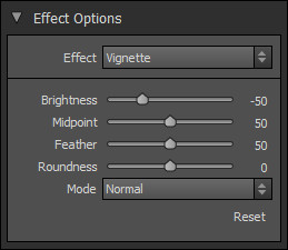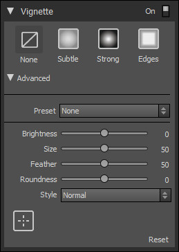 Panel Vignette je obdobou funkce Post-Crop Vignetting z panelu Effects z Adobe Photoshop Lightroomu. Navíc je zde možnost libovolně určit střed vinětace, tedy efekt, který lze aplikovat v Lightroomu 5 nástrojem Radial Filter. K dispozici je několik přednastavení Burnout, Center Spot, Edges to Black, Edges to White, Edges, Strong, Subtle, Vivid Edges. U vinětace můžeme navolit světlost (od úplně černé až po plně bílou), velikost, prolnutí, zaoblenost a styl (Normal, Subtle, Soft). Není tedy problém při extrémních hodnotách dosáhnout například tenkého černého rámečku s pravoúhlými rohy. Toto Adobe Photoshop Lightroom neumožňuje, i při minimální hodnotě Roundness zůstávají rohy rámečku v Lightroomu zaoblené.