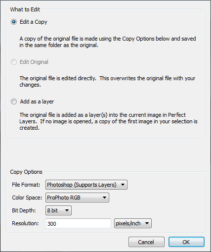V okně, které se otevře, zvolíme, kde budeme provádět editace. Na výběr máme editaci původního souboru (Edit Original), editaci kopie souboru (Edit a Copy) a nebo přidání otevíraného souboru jako nové vrstvy do souboru otevřeného (Add as a layer). Pokud needitujeme přímo originál souboru, máme na výběr formát v jakém budeme se souborem pracovat. Pokud budeme používat vrstvy, musíme zvolit formát PSD (nativní formát Photoshopu). Dále máme na výběr formát TIFF (bezztrátová komprese, umožňuje práci v 16-bitové barevné hloubce) a JPEG (ztrátová komprese, pouze 8-bitová barevná hloubka).
