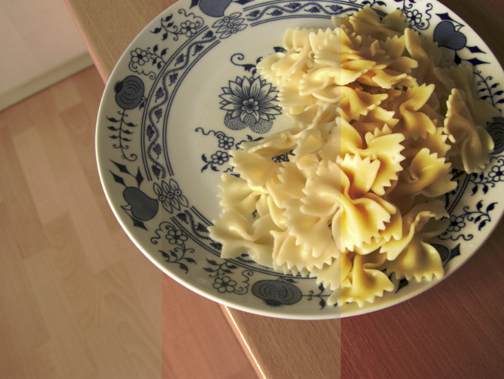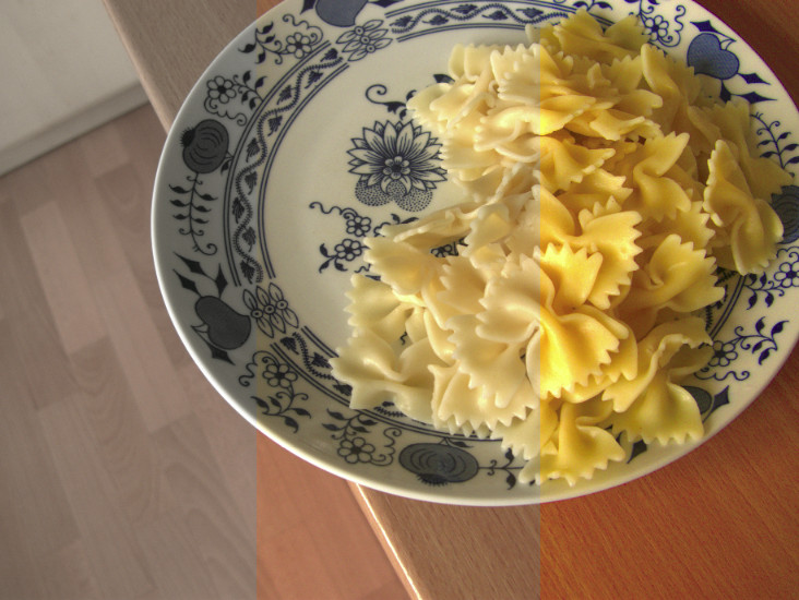 Úpravy jsem testoval na jednoduché interiérové fotografii pořízené v přirozeném světle pokročilým kompaktním fotoaparátem (Panasonic Lumix DMC-LX3) v režimu automatického vyvážení bílé. Fotografie byla pořízena při ISO 100 (nativní ISO fotoaparátu je ISO 80). Fotografovaná scéna se bez problémů vešla do dynamického rozsahu snímače a je mírně podexponovaná (viz histogramy).