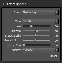 Posledním panelem je panel Sharpening. K dispozici je opět řada přednastavení podle toho, zda opravujeme chybně zaostřenou fotografii, či připravujeme zaostření pro výstup na monitor nebo pro tisk. K dispozici máme tři metody zaostření fotografie – vysoký práh (High Pass), progresivní doostření (Progressive) a maskování neostrosti (Unsharp Mask).