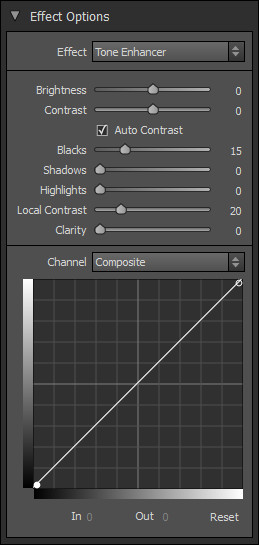 Funkce obsažené v modulu ENHANCE jsou přístupné v rámci modulu EFFECTS. Jedná se o filtry Color Enhancer, Sharpening, Tone Enhancer a Vignette.