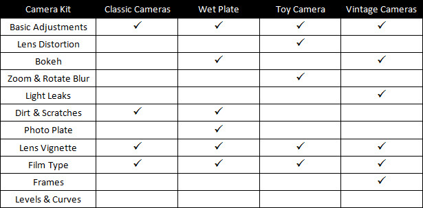 Pro zjednodušení práce jsou v aplikaci k dispozici čtyři základní sestavení filtrů, podle toho jakého efektu chceme dosáhnout. Jedná se o napodobení vzhledu klasických analogových fotoaparátů (Classic cameras), napodobení starých fotografií exponovaných na emulze nanesené na skleněných deskách (Wet Plate), napodobení v současnosti velmi populárního vzhledu snímání s levnou plastovou kamerou (Toy Camera) a napodobení vzhledu snímků pořízených starými aparáty (Vintage Cameras).