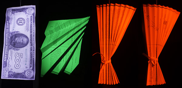 Bankovku jsem následně vytiskl a trochu pomačkal. Z potištěných papírů formátu A4 jsem vymodeloval oponu a pódium a vše nafotil ve tmě, kdy jsem jednotlivé části vybarvil pomocí světelného pera.