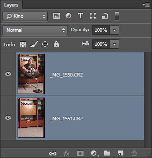 Nafocené fotografie, tedy scénu s portrétem a poté scénu zcela prázdnou, jsem vyvolal v Lightroomu a načetl je jako vrstvy do Photoshopu. Při fotografování jsem použil stativ, ale i tak byly fotografie navzájem trochu pohnuté. Nejspíš jsem si mezi pořízením snímků do stativu trochu drknul. To naštěstí není pro Photoshop žádný velký problém. V panelu Layers (Vrstvy) jsem obě vrstvy označil