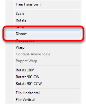 Výběr jsem zrušil (CTRL + D) a zvolil jsem nástroj pro volnou transformaci Edit → Free Transform klávesovou zkratkou CTRL + F. V místní nabídce (kliknutí pravým tlačítkem nad objektem) jsem zvolil režim úprav Distort.