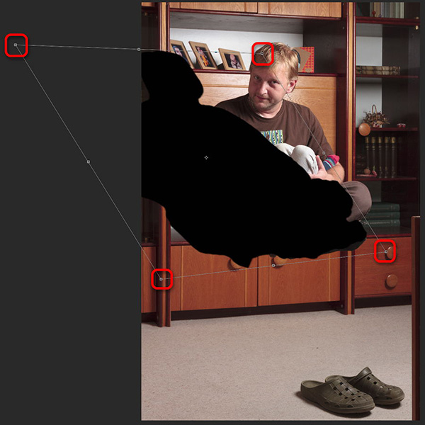 Pro získání reálnějšího výsledku je potřeba dokreslit stín. Ten nemusí přesně odpovídat původní fotografii, ale musí být dostatečně logický k použitému světlu. Postupoval jsem tak, že jsem pomocí nástroje pro výběr Lasoo Tool (laso) nahrubo obtáhl objekt, který má vrhat stín.