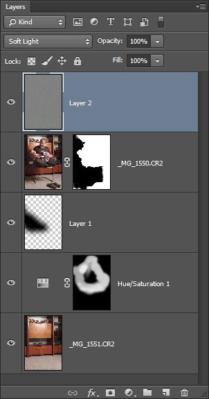 Poslední úpravou je přidání trochu šumu přes celou fotografii, který bude sloužit pro její vhledovou kompaktnost. Pro tento účel jsem si vložil novou vrstvu, u které jsem nastavil režim prolnutí na Soft Light a vyplnil jsem jí 50% šedou. Díky tomu se tato vrstva chová jako neutrální. Režim prolnutí Soft Light slouží ke zvýšení kontrastu. Tam kde je tonalita vrstvy nižší než 50% šedá dochází ke ztmavení obrazu a naopak, tam kde je tonalita vrstvy vyšší než 50% šedá dochází k zesvětlení obrazu.