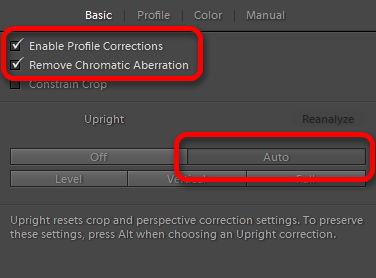 Poslední úpravou v oddílu „Lens Correction“ je nastavení funkce „Upright“. Jedná se o poměrně novou, ale velmi účinnou funkci na srovnání obrazu. Tento nástroj je schopen zcela automaticky srovnat naklonění horizontu (tlačítko „Level“) nebo sbíhání svislicí (tlačítko „Vertical“). Tlačítkem „Full“ se provedou obě korekce najednou. Pokud si nejste jisti, kterou korekci fotografie potřebuje, pak můžete stisknout tlačítko „Auto“ a Lightroom provede vyhodnocení za Vás. V podstatné většině případů tato funkce funguje až zázračně přesně a není nutné dělat už žádné další ruční zásahy.