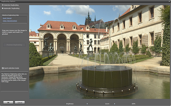 Většina aplikací tato místa určí automaticky a dovolí nám pouze určit, ze kterého zdrojového snímku bude použita kresba. V rámci funkce odstranění duchů ve Photomatixu máme širší možnosti. U automatické redukce můžeme volit její sílu, takže např. odstranění pohybu listí na stromech způsobených větrem nám postačí nižší intenzita funkce. To je důležité, neboť čím je funkce odstranění „duchů“ intenzivnější, tím více je sloučený obraz nahrazen obrazem pouze z jednoho snímku a zbytečně tak přicházíme o obrazová data. Druhou, v rámci konkurenčních aplikací ojedinělou, možností je uživatelská volba ploch, na které se má redukce „duchů“ uplatnit. V našem případě, kde ve fotografii nemáme předměty pohybující se z místa na místo, jsem použil automatickou redukci, která se aplikovala zejména na vodu u kašny.